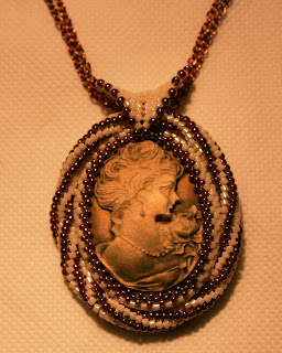 Collana con due fili di catena in rame e chiusura in rame, cammeo incastonato con miyuki e circondato da spirale realizzata con miyuki tecnica herringbone